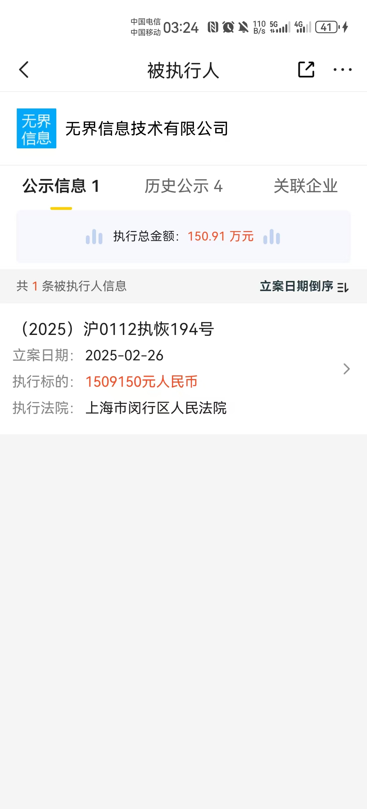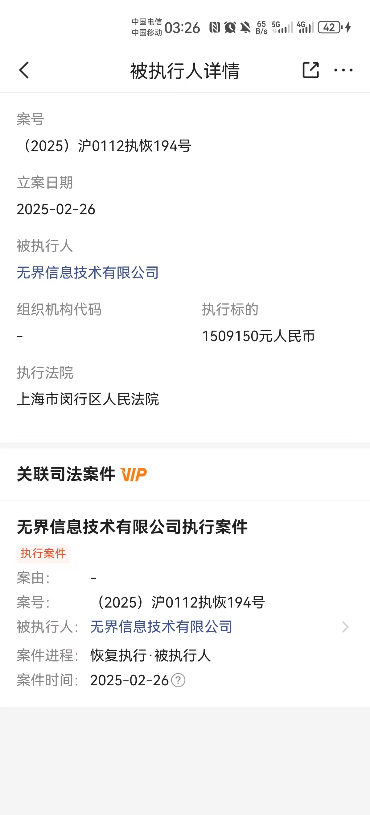 近期高度关注到,无界信息技术有限公司正面临被执行信息。